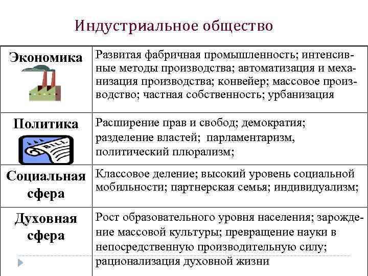 Индустриальное общество Экономика Развитая фабричная промышленность; интенсив- ные методы производства; автоматизация и механизация производства; конвейер; массовое производство; частная собственность; урбанизация Политика Расширение прав и свобод; демократия; разделение властей; парламентаризм, политический плюрализм; Социальная Классовое деление; высокий уровень социальной мобильности; партнерская семья; индивидуализм; сфера Духовная сфера Рост образовательного уровня населения; зарождение массовой культуры; превращение науки в непосредственную производительную силу; рационализация духовной жизни
