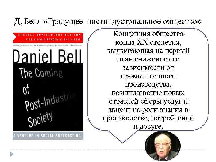 Д. Белл «Грядущее постиндустриальное общество» Концепция общества конца XX столетия, выдвигающая на первый план снижение его зависимости от промышленного производства, возникновение новых отраслей сферы услуг и акцент на роли знания в производстве, потреблении и досуге.