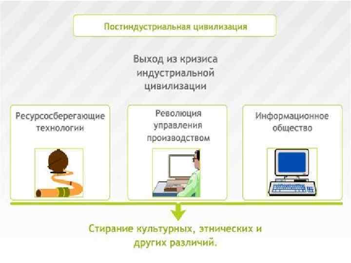 v Особая роль науки и образования; непрерывное образование. v Определяющий фактор развития – знание, информация (поэтому этот тип общества еще называют информационным). v Полноценное правовое государство, сильное гражданское общество. К постиндустриальному обществу переход осуществили пока лишь только США и Япония.