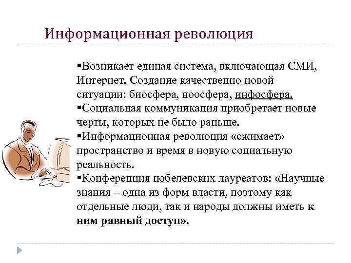 Информационная революция §Возникает единая система, включающая СМИ, Интернет. Создание качественно новой ситуации: биосфера, ноосфера, инфосфера. §Социальная коммуникация приобретает новые черты, которых не было раньше. §Информационная революция «сжимает» пространство и время в новую социальную реальность. §Конференция нобелевских лауреатов: «Научные знания – одна из форм власти, поэтому как отдельные люди, так и народы должны иметь к ним равный доступ» .