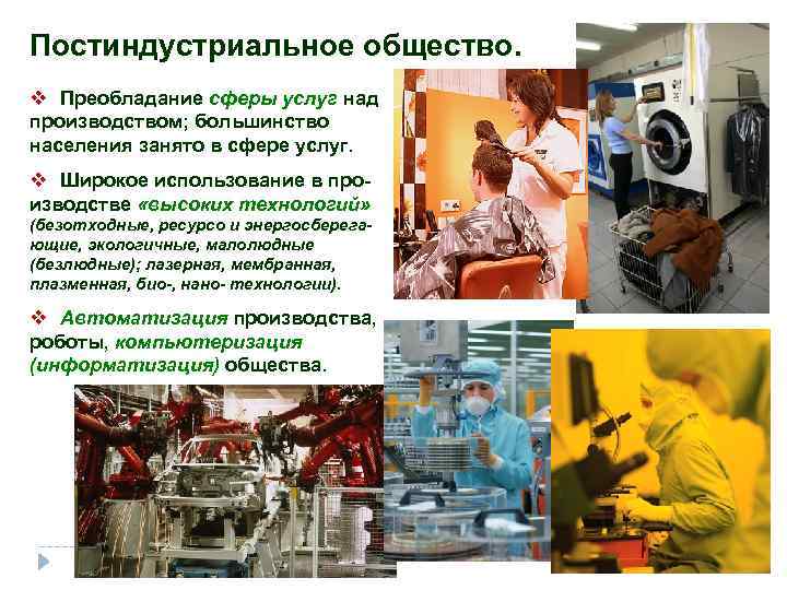 Постиндустриальное общество. v Преобладание сферы услуг над производством; большинство населения занято в сфере услуг. v Широкое использование в производстве «высоких технологий» (безотходные, ресурсо и энергосберегающие, экологичные, малолюдные (безлюдные); лазерная, мембранная, плазменная, био-, нано- технологии). v Автоматизация производства, роботы, компьютеризация (информатизация) общества.