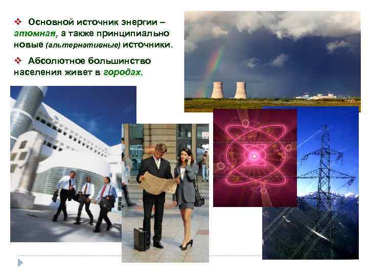 v Основной источник энергии – атомная, а также принципиально новые (альтернативные) источники. v Абсолютное большинство населения живет в городах.