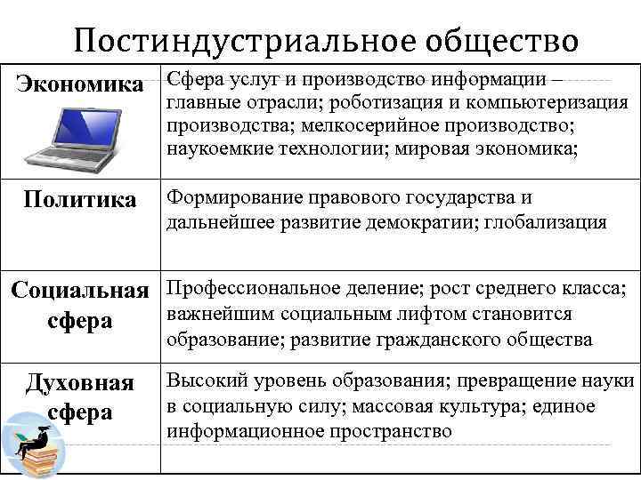 Постиндустриальное общество Экономика Сфера услуг и производство информации – главные отрасли; роботизация и компьютеризация производства; мелкосерийное производство; наукоемкие технологии; мировая экономика; Политика Формирование правового государства и дальнейшее развитие демократии; глобализация Социальная Профессиональное деление; рост среднего класса; важнейшим социальным лифтом становится сфера образование; развитие гражданского общества Духовная сфера Высокий уровень образования; превращение науки в социальную силу; массовая культура; единое информационное пространство