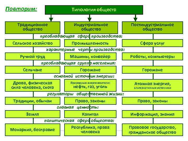 Повторим: Типология обществ Традиционное Индустриальное Постиндустриальное общество преобладающая сфера производства: Сельское хозяйство Промышленность Сфера услуг характерные черты производства: Ручной труд Машины, конвейер Роботы, компьютеры преобладающая группа населения: Сельчане Горожане основной источник энергии: Природные энергоносители: Дрова, физическая Атомная энергия, нефть, газ, уголь альтернативные источники сила человека, скота регуляторы общественной жизни: Традиции, обычаи Право, законы главная ценность: Земля Капитал Информация, знания политическая сфера общества: Правовое государство, Республика, права Монархия, бесправие человека гражданское общество
