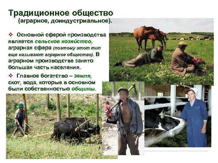 Традиционное общество (аграрное, доиндустриальное). v Основной сферой производства является сельское хозяйство, аграрная сфера (поэтому этот тип еще называют аграрное общество). В аграрном производстве занято большая часть населения. v Главное богатство – земля, скот, вода, которые в основном были собственностью общины.