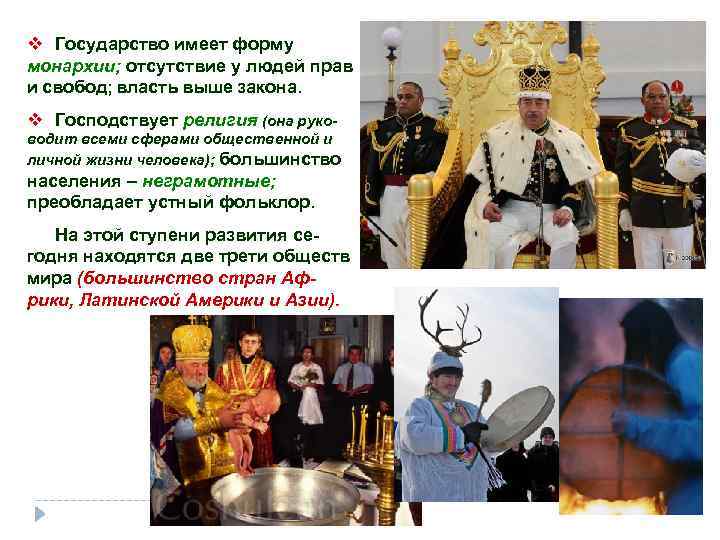 v Государство имеет форму монархии; отсутствие у людей прав и свобод; власть выше закона. v Господствует религия (она руководит всеми сферами общественной и личной жизни человека); большинство населения – неграмотные; преобладает устный фольклор. На этой ступени развития сегодня находятся две трети обществ мира (большинство стран Африки, Латинской Америки и Азии).