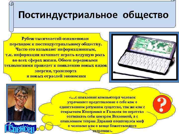 Постиндустриальное общество Рубеж тысячелетий ознаменован переходом к постиндустриальному обществу. Часто его называют информационным, т. к. информация начинает играть ведущую роль во всех сферах жизни. Обмен передовыми технологиями приведет к появлению новых видов энергии, транспорта и новых отраслей экономики Компактный ПК «…с появление компьютера человек утрачивает представление о себе как о единственном разумном существе, так же как с открытием Коперника и Галилея он перестал осознавать себя центром Вселенной, а с появлением теории Дарвина пошатнулся миф о человеке как о венце божественного творения» . ?