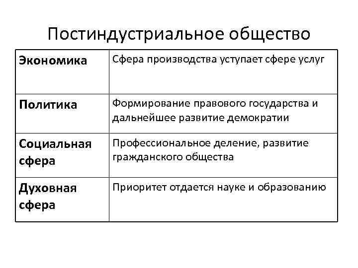 Постиндустриальное общество Экономика Сфера производства уступает сфере услуг Политика Формирование правового государства и дальнейшее развитие демократии Социальная сфера Профессиональное деление, развитие гражданского общества Духовная сфера Приоритет отдается науке и образованию
