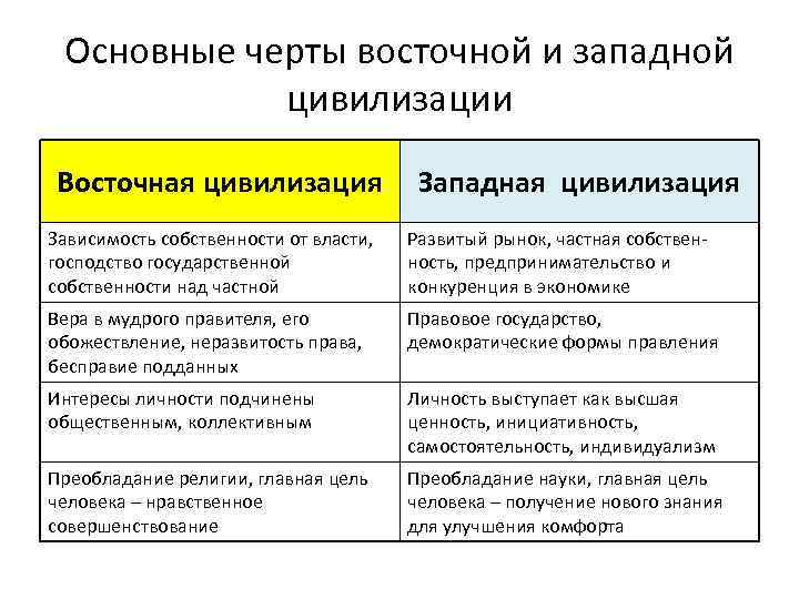 Основные черты восточной и западной цивилизации Восточная цивилизация Западная цивилизация Зависимость собственности от власти, господство государственной собственности над частной Развитый рынок, частная собственность, предпринимательство и конкуренция в экономике Вера в мудрого правителя, его обожествление, неразвитость права, бесправие подданных Правовое государство, демократические формы правления Интересы личности подчинены общественным, коллективным Личность выступает как высшая ценность, инициативность, самостоятельность, индивидуализм Преобладание религии, главная цель человека – нравственное совершенствование Преобладание науки, главная цель человека – получение нового знания для улучшения комфорта