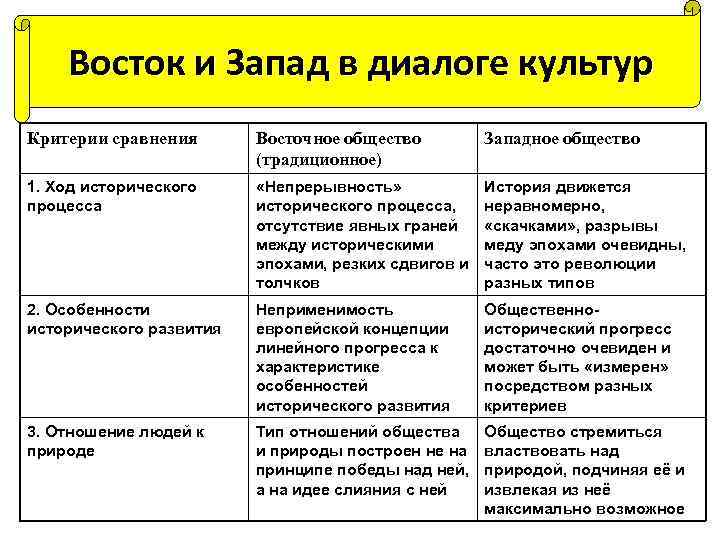 Восток и Запад в диалоге культур Критерии сравнения Восточное общество (традиционное) Западное общество 1. Ход исторического процесса «Непрерывность» исторического процесса, отсутствие явных граней между историческими эпохами, резких сдвигов и толчков История движется неравномерно, «скачками» , разрывы меду эпохами очевидны, часто это революции разных типов 2. Особенности исторического развития Неприменимость европейской концепции линейного прогресса к характеристике особенностей исторического развития Общественноисторический прогресс достаточно очевиден и может быть «измерен» посредством разных критериев 3. Отношение людей к природе Тип отношений общества и природы построен не на принципе победы над ней, а на идее слияния с ней Общество стремиться властвовать над природой, подчиняя её и извлекая из неё максимально возможное