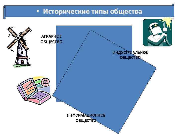 • Исторические типы общества АГРАРНОЕ ОБЩЕСТВО ИНДУСТРИАЛЬНОЕ ОБЩЕСТВО ИНФОРМАЦИОННОЕ ОБЩЕСТВО