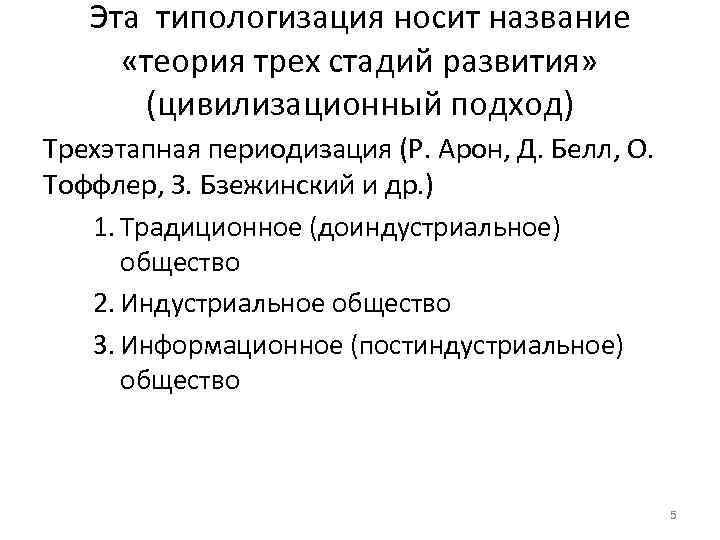 Эта типологизация носит название «теория трех стадий развития» (цивилизационный подход) Трехэтапная периодизация (Р. Арон, Д. Белл, О. Тоффлер, З. Бзежинский и др. ) 1. Традиционное (доиндустриальное) общество 2. Индустриальное общество 3. Информационное (постиндустриальное) общество 5