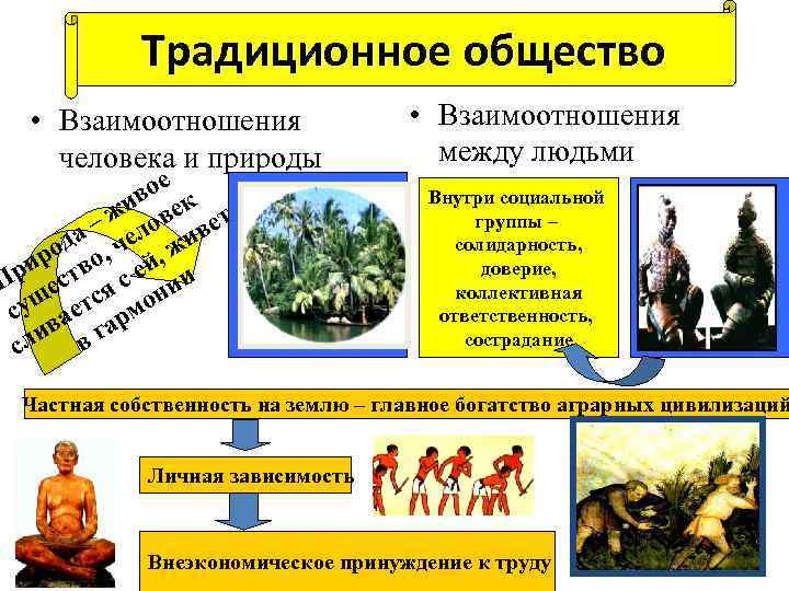 Традиционное общество • Взаимоотношения человека и природы е во к жи ове ет а – чел ив д ро во, й, ж ри ст с е ии П е я ущ аетс мон с в р га и в сл • Взаимоотношения между людьми Внутри социальной группы – солидарность, доверие, коллективная ответственность, сострадание Частная собственность на землю – главное богатство аграрных цивилизаций Личная зависимость Внеэкономическое принуждение к труду