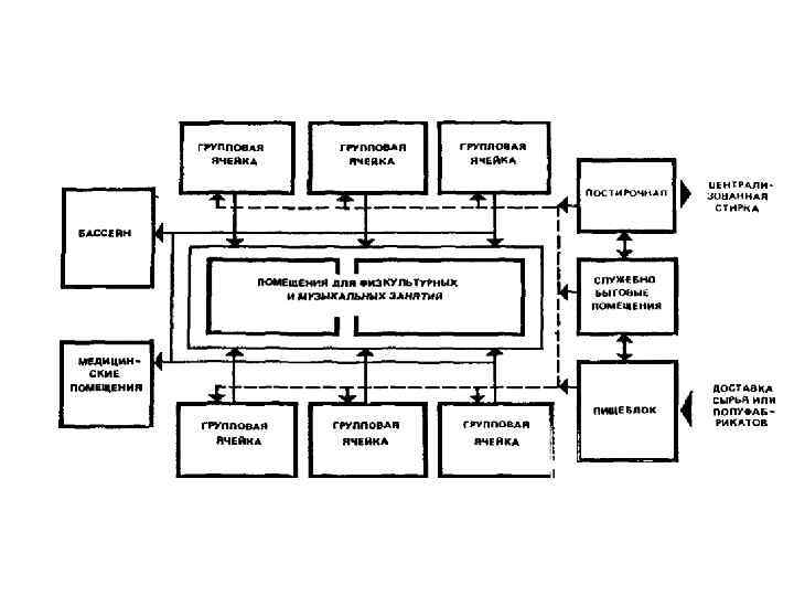 Здания ДОУ включают: групповые ячейки - изолированные помещения, принадлежащие каждой детской группе; специализированные помещения для занятий с детьми, предназначенные для поочередного использования всеми или несколькими детскими группами; сопутствующие помещения (медицинские, пищеблок, постирочная); служебно-бытовые помещения для персонала.