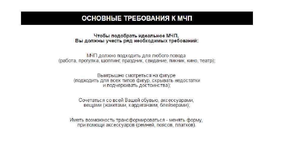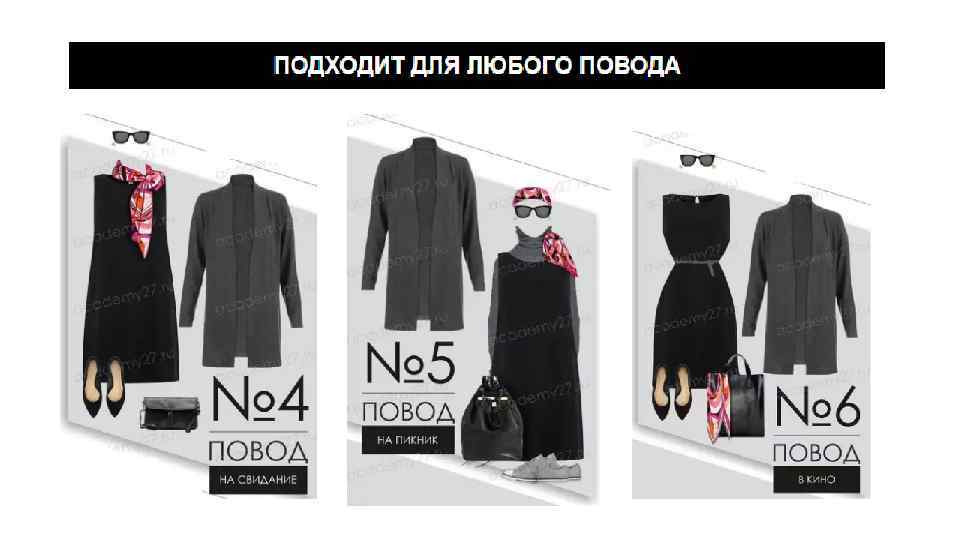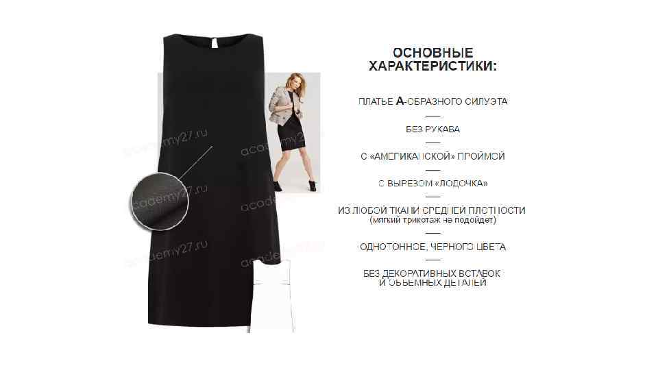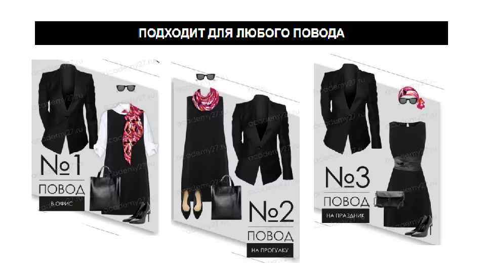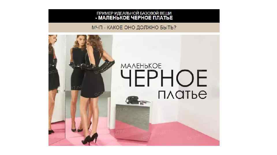 Little black dress В зависимости от модных трендов, МПЧ меняется в своих деталях, тканях и т. п. , но неизменно присутствует в гардеробе каждой стильной женщины вот уже почти сто лет. Главное для МПЧ: Элегантность и шик Простота и универсальность Высокое качество