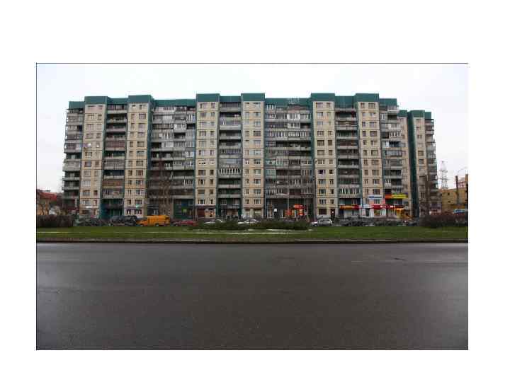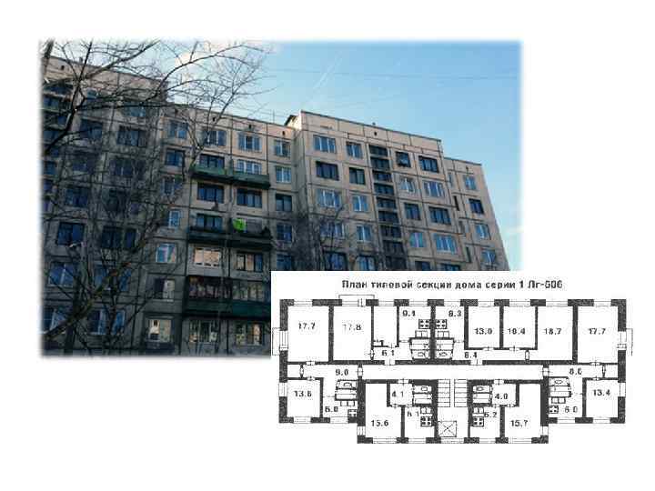 Серия 1 -ЛГ 606 http: //domavspb. narod. ru/index/0 -31 • • • • Этажность: 9 Материал наружных стен: бетонные панели Высота жилых помещений: 250 см Квартиры: одно, двух, трех, четырехкомнатные (на первых этажах) Производитель: Полюстровский и Кузнецовский ДСК Годы строительства: 1967 -1973 Основные районы расположения: Московский, Фрунзенский, Красногвардейский, Калининский Это вторая по массовости жилищная серия образца второй половины 1960 -х годов, ее производители – Полюстровский и Кузнецовский ДСК. Эти дома строились с 1967 по 1973 год и отличались улучшенными по сравнению с 602 -й серией потребительскими характеристиками. Именно поэтому дома 606 -й серии часто строили для ЖСК. Первые этажи во многих домах – нежилые, в них располагаются магазины. Применительно к этим панельным постройкам, впервые можно говорить о пластике фасадов: со стороны входа в парадную центральная часть секции выступает вперед, образуя выступ с лестнично-лифтовым узлом и двумя однокомнатными квартирами (кухня – 8 кв. м, комната – 15, 7 кв. м, прихожая со встроенным шкафом, раздельный санузел). Лестничная площадка в доме 606 -й серии – это темный коридор на шесть или (в некоторых вариантах) семь квартир. Между тем такая конструкция имеет положительную особенность, по достоинству оцененную жильцами: у них есть возможность отделить часть коридора общей дверью. Во всех квартирах, кроме однокомнатных и тех, что расположены на первых этажах, есть балконы. Причем в трехкомнатных квартирах – они на два окна. В домах серии 1 -606 -Лг в принципе не предусмотрено смежных комнат, однако в свое время этот плюс обернулся минусом – возвратом коммунального заселения. В концах лестничной площадки-коридора обычно располагаются двусторонние двухкомнатные квартиры (прихожая – 9 кв. м, вместительная кладовка, комнаты – 18 и 13, 5 кв. м, кухня – 5, 8 кв. м). Кроме этого, обычно на этаже располагается односторонняя двухкомнатная квартира (комнаты – 17, 8, 11 кв. м, кухня – 9 кв. м), а также трехкомнатная (в некоторых модификациях вместо нее – две однокомнатные). Потребительские качества Из всех панельных брежневок обозначенного нами периода – это самые теплые и наиболее удобные дома. Пустотные перекрытия и настилы обеспечивают хорошую звукоизоляцию, толстые наружные стены с широкими подоконниками – меньшую зависимость домашнего комфорта от изменения направления ветра, удачно продуманные планировки квартир (в стандартном исполнении все межквартирные стены являются несущими) надежно изолируют от соседей по этажу: в этих домах неплохая звукоизоляция. Кроме того, обычным явлением в подобных домах были качественные паркетные полы в комнатах, хорошая гидроизоляция в санузлах. Однако есть и серьезные недостатки. Например, потолочные балки, расположенные «ступенями» вдоль стен в кухнях и комнатах, уменьшают высоту помещения у стены до 2, 35 м – не любую мебель здесь можно поставить. К тому же междуэтажное перекрытие являет собой «пирог» из бетонной плиты толщиной всего 5 см (!), на который положены лаги и доски, щедро просыпанные песком. При ремонте такой квартиры с заменой полов нужно быть предельно аккуратным: при сверлении отверстий, чтобы закрепить новые лаги, можно запросто пробить отверстие к соседям снизу. Для всех квартир в домах серии 1 -Лг-606 (кроме однокомнатных) реализовано множество вариантов перепланировок, с уче