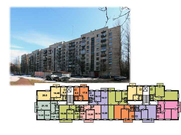 • Старая панель / хрущевки / пятиэтажные дома первых массовых серий • • История массового панельного домостроения началась в 1955 году, когда вышло Постановление ЦК КПСС и Совета Министров СССР «Об устранении излишеств в проектировании и строительстве» , предписавшее разработать типовые проекты, чтобы к 1980 -му году, когда наступит коммунизм, каждая советская семья встретила его в отдельной квартире. Основу проектирования хрущевок положили строительные нормативы 1957 года, предусматривавшие высоту жилого помещения от пола до потолка 2, 5 м, миниатюрные (от 4, 5 кв. м), кухни, а также допускавшие устройство смежных комнат и совмещенных санузлов. В качестве обязательных элементов квартиры назывались кладовая (либо встроенный шкаф), спальни (6 кв. м на одного человека, 8 кв. м на двоих), общая комната (не меньше 14 кв. м). Недостатки пятиэтажек, традиционно считающихся самым дешевым классом петербургского жилья, потенциальным покупателям уже хорошо известны. В них отсутствуют лифт и мусоропровод. Но есть у них и неоспоримые преимущества. Вопервых, хрущевки ремонтопригодны: их санация с заменой инженерных сетей и утеплением фасадов способна решить все проблемы, кроме недостатка квадратных метров. Во-вторых, основные микрорайоны расположения питерских хрущевок давно уже не являются городскими окраинами. Эти обстоятельства предопределяет хорошую ликвидность квартир в хрущевках на сегодняшнем рынке недвижимости. В разных районах Санкт-Петербурга доминируют разные типы хрущевок, что исторически обусловлено близостью территории застройки к тому или иному домостроительному комбинату.