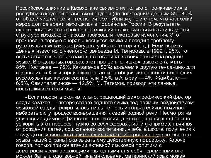 Российское влияние в Казахстане связано не только с про живанием в республике крупной славянской группы (по пос ледним данным 35— 40% от общей численности населения рес публики), но и с тем, что казахский народ долгое время нахо дился в подданстве России. В результате существования бок о бок на протяжении нескольких веков в культурной структуре казахского народа произошли некоторые изменения. Этот про цесс, в первую очередь, коснулся языка и породил проблему русскоязычных казахов (уйгуров, узбеков, татар и т. д. ). Если верить данным известного ученого страноведа М. Татимова, в 1992 г. 25%, то есть четвертая часть казахов, не говорила в своих семьях на родном языке. В отдельных городах этот про цент слишком высок: в Алматы — 85%, Костанае — 75%, Ка раганде 80%; возьмем и другую тенденцию для сравнения: в Кызылординской области от общей численности населения русскоязычные казахи составляли 3, 5%, в Атырау — 4%, Жамбыле — 6, 5%, Семипалатинске — 12, 5%. М. Татимов, приводя эти данные, подытоживает свои мысли: «Если говорить окончательно, решающий демографичес кий фактор среди казахов — потеря своего родного языка под прямым воздействием языковой среды прекратилась лишь те перь и только сейчас начинает набирать силу процесс воз вращения к своей родной речи. Несмотря на улучшение де мографического положения, для того, чтобы еще больше ус корить этот процесс, нужно во всех сферах жизни (например, начиная от рождения детей, дошкольного воспитания, учебы в школе, приучения к труду до официального применения в каждой отрасли государственного языка нашей страны) ока зывать ему действенную поддержку. Короче говоря, только при сочетании активной языковой политики с демографи чески решающими, выгодными для себя переменами она мо жет быть плодотворной, иными словами, материнский язык можем