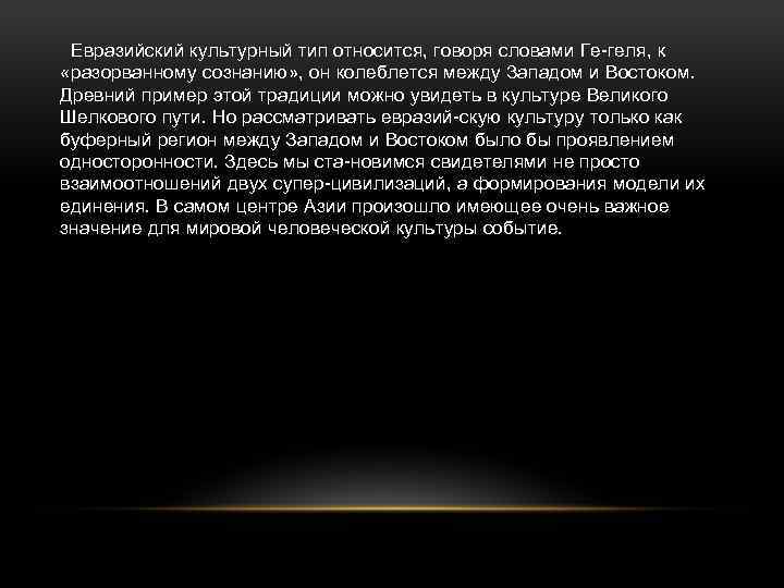 Евразийский культурный тип относится, говоря словами Ге геля, к «разорванному сознанию» , он колеблется между Западом и Востоком. Древний пример этой традиции можно увидеть в культуре Великого Шелкового пути. Но рассматривать евразий скую культуру только как буферный регион между Западом и Востоком было бы проявлением односторонности. Здесь мы ста новимся свидетелями не просто взаимоотношений двух супер цивилизаций, а формирования модели их единения. В самом центре Азии произошло имеющее очень важное значение для мировой человеческой культуры событие.