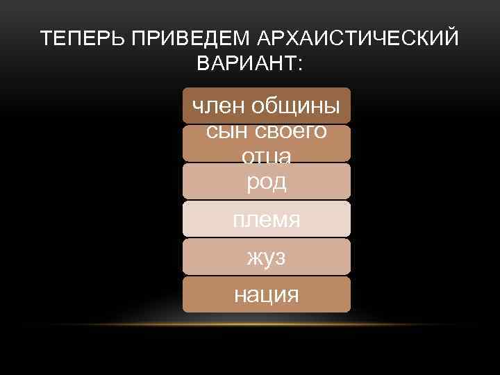 ТЕПЕРЬ ПРИВЕДЕМ АРХАИСТИЧЕСКИЙ ВАРИАНТ: член общины сын своего отца род племя жуз нация