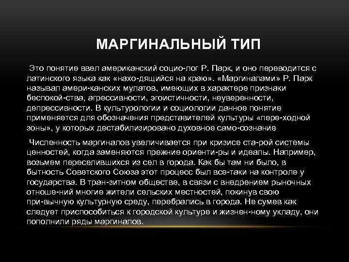 МАРГИНАЛЬНЫЙ ТИП Это понятие ввел американский социо лог Р. Парк, и оно переводится с латинского языка как «нахо дящийся на краю» . «Маргиналами» Р. Парк называл амери канских мулатов, имеющих в характере признаки беспокой ства, агрессивности, эгоистичности, неуверенности, депрессивности. В культурологии и социологии данное понятие применяется для обозначения представителей культуры «пере ходной зоны» , у которых дестабилизировано духовное само сознание. Численность маргиналов увеличивается при кризисе ста рой системы ценностей, когда заменяются прежние ориенти ры и идеалы. Например, возьмем переселившихся из сел в города. Как бы там ни было, в бытность Советского Союза этот процесс был все таки на контроле у государства. В тран зитном обществе, в связи с внедрением рыночных отноше ний многие жители сельских местностей, покинув свою при вычную культурную среду, перебрались в города. Не сумев как следует приспособиться к городской культуре и жизнен ному укладу, они пополнили ряды маргиналов.