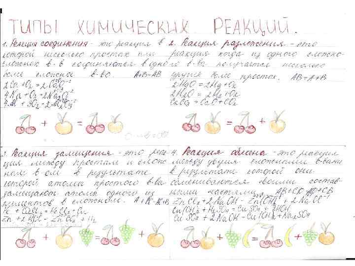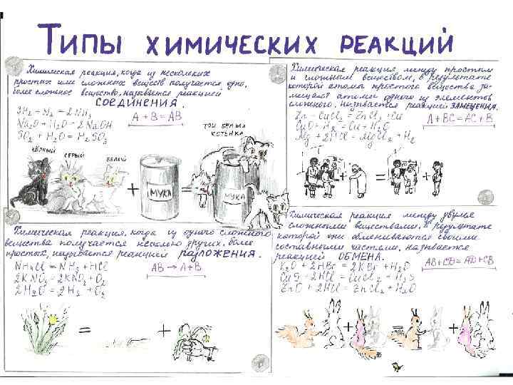 Домашнее задание: Оформить на альбомном листе работу, где необходимо привести примеры разных типов реакций и нарисовать рисунки, иллюстрирующие эти типы. Примеры таких работ приведены на следующих слайдах.
