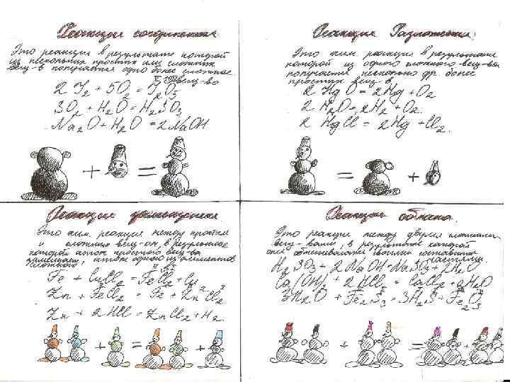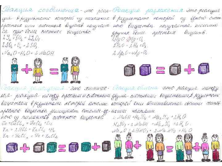 Реакция соединения А + В = АВ Реакция разложения АВ = А + В Реакция замещения А+ВС=АС+В Реакция обмена АВ+СД=АД+СВ = + + = = + + + = +