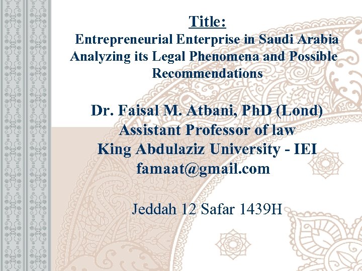Title: Entrepreneurial Enterprise in Saudi Arabia Analyzing its Legal Phenomena and Possible Recommendations Dr. Faisal M. Atbani, Ph. D (Lond) Assistant Professor of law King Abdulaziz University - IEI famaat@gmail. com Jeddah 12 Safar 1439 H