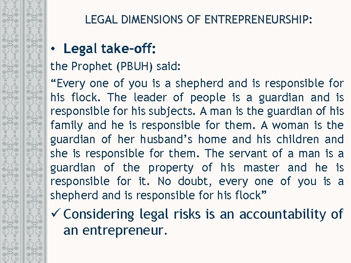 LEGAL DIMENSIONS OF ENTREPRENEURSHIP: • Legal take-off: the Prophet (PBUH) said: “Every one of you is a shepherd and is responsible for his flock. The leader of people is a guardian and is responsible for his subjects. A man is the guardian of his family and he is responsible for them. A woman is the guardian of her husband’s home and his children and she is responsible for them. The servant of a man is a guardian of the property of his master and he is responsible for it. No doubt, every one of you is a shepherd and is responsible for his flock” ü Considering legal risks is an accountability of an entrepreneur.