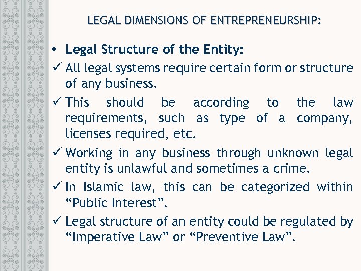 LEGAL DIMENSIONS OF ENTREPRENEURSHIP: • Legal Structure of the Entity: ü All legal systems require certain form or structure of any business. ü This should be according to the law requirements, such as type of a company, licenses required, etc. ü Working in any business through unknown legal entity is unlawful and sometimes a crime. ü In Islamic law, this can be categorized within “Public Interest”. ü Legal structure of an entity could be regulated by “Imperative Law” or “Preventive Law”.