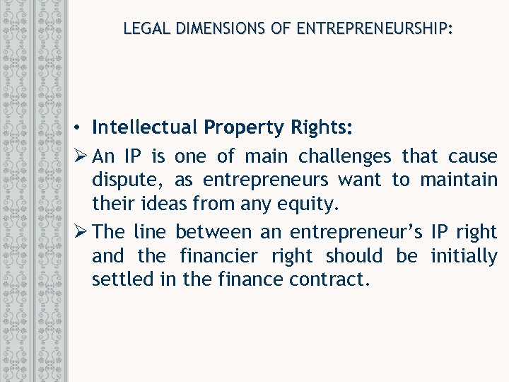 LEGAL DIMENSIONS OF ENTREPRENEURSHIP: • Intellectual Property Rights: Ø An IP is one of main challenges that cause dispute, as entrepreneurs want to maintain their ideas from any equity. Ø The line between an entrepreneur’s IP right and the financier right should be initially settled in the finance contract.