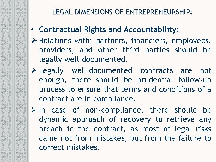 LEGAL DIMENSIONS OF ENTREPRENEURSHIP: • Contractual Rights and Accountability: Ø Relations with; partners, financiers, employees, providers, and other third parties should be legally well-documented. Ø Legally well-documented contracts are not enough, there should be prudential follow-up process to ensure that terms and conditions of a contract are in compliance. Ø In case of non-compliance, there should be dynamic approach of recovery to retrieve any breach in the contract, as most of legal risks came not from mistakes, but from the failure to correct mistakes.