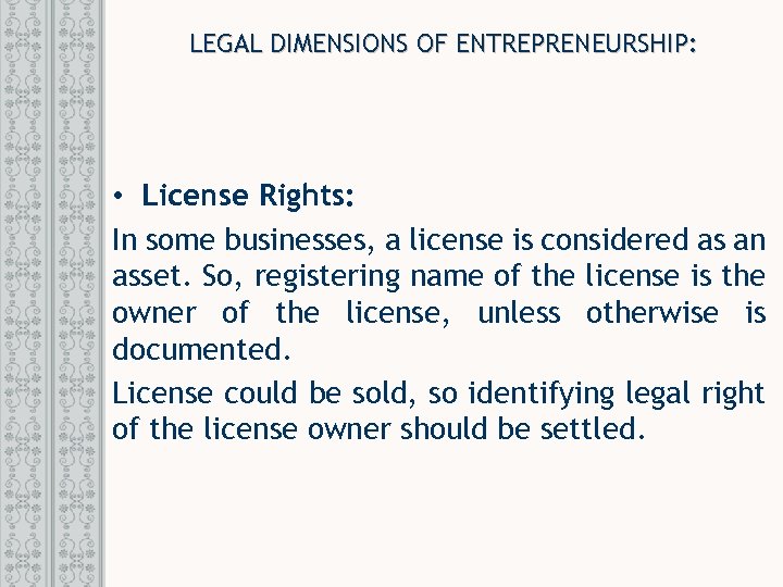 LEGAL DIMENSIONS OF ENTREPRENEURSHIP: • License Rights: In some businesses, a license is considered as an asset. So, registering name of the license is the owner of the license, unless otherwise is documented. License could be sold, so identifying legal right of the license owner should be settled.