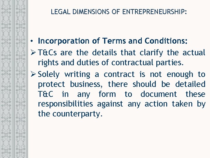 LEGAL DIMENSIONS OF ENTREPRENEURSHIP: • Incorporation of Terms and Conditions: Ø T&Cs are the details that clarify the actual rights and duties of contractual parties. Ø Solely writing a contract is not enough to protect business, there should be detailed T&C in any form to document these responsibilities against any action taken by the counterparty.