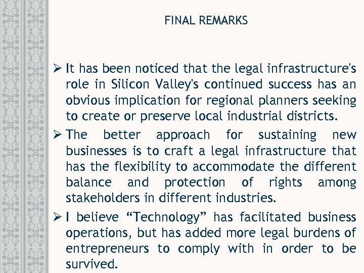FINAL REMARKS Ø It has been noticed that the legal infrastructure's role in Silicon Valley's continued success has an obvious implication for regional planners seeking to create or preserve local industrial districts. Ø The better approach for sustaining new businesses is to craft a legal infrastructure that has the flexibility to accommodate the different balance and protection of rights among stakeholders in different industries. Ø I believe “Technology” has facilitated business operations, but has added more legal burdens of entrepreneurs to comply with in order to be survived.