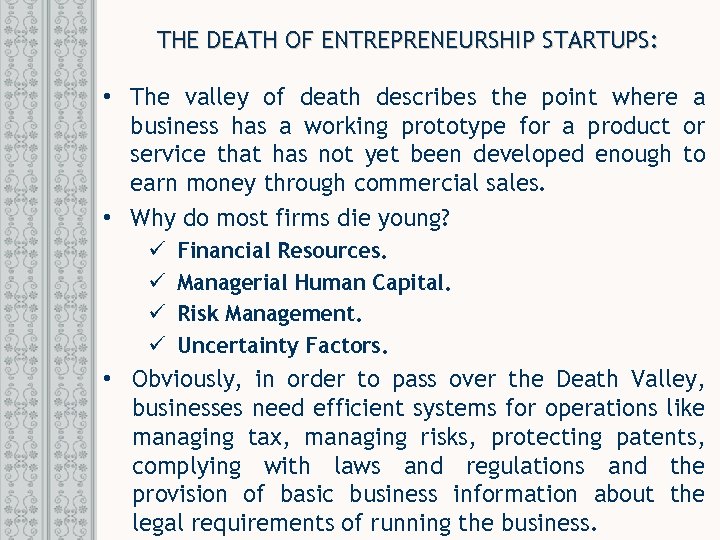 THE DEATH OF ENTREPRENEURSHIP STARTUPS: • The valley of death describes the point where a business has a working prototype for a product or service that has not yet been developed enough to earn money through commercial sales. • Why do most firms die young? ü ü Financial Resources. Managerial Human Capital. Risk Management. Uncertainty Factors. • Obviously, in order to pass over the Death Valley, businesses need efficient systems for operations like managing tax, managing risks, protecting patents, complying with laws and regulations and the provision of basic business information about the legal requirements of running the business.