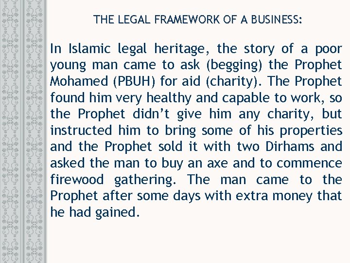 THE LEGAL FRAMEWORK OF A BUSINESS: In Islamic legal heritage, the story of a poor young man came to ask (begging) the Prophet Mohamed (PBUH) for aid (charity). The Prophet found him very healthy and capable to work, so the Prophet didn’t give him any charity, but instructed him to bring some of his properties and the Prophet sold it with two Dirhams and asked the man to buy an axe and to commence firewood gathering. The man came to the Prophet after some days with extra money that he had gained.