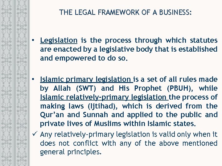 THE LEGAL FRAMEWORK OF A BUSINESS: • Legislation is the process through which statutes are enacted by a legislative body that is established and empowered to do so. • Islamic primary legislation is a set of all rules made by Allah (SWT) and His Prophet (PBUH), while Islamic relatively-primary legislation the process of making laws (Ijtihad), which is derived from the Qur’an and Sunnah and applied to the public and private lives of Muslims within Islamic states. ü Any relatively-primary legislation is valid only when it does not conflict with any of the above mentioned general principles.