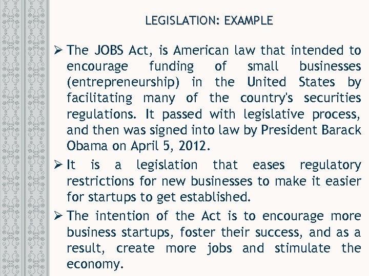 LEGISLATION: EXAMPLE Ø The JOBS Act, is American law that intended to encourage funding of small businesses (entrepreneurship) in the United States by facilitating many of the country's securities regulations. It passed with legislative process, and then was signed into law by President Barack Obama on April 5, 2012. Ø It is a legislation that eases regulatory restrictions for new businesses to make it easier for startups to get established. Ø The intention of the Act is to encourage more business startups, foster their success, and as a result, create more jobs and stimulate the economy.