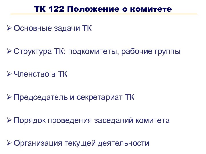 ТК 122 Положение о комитете Ø Основные задачи ТК Ø Структура ТК: подкомитеты, рабочие группы Ø Членство в ТК Ø Председатель и секретариат ТК Ø Порядок проведения заседаний комитета Ø Организация текущей деятельности