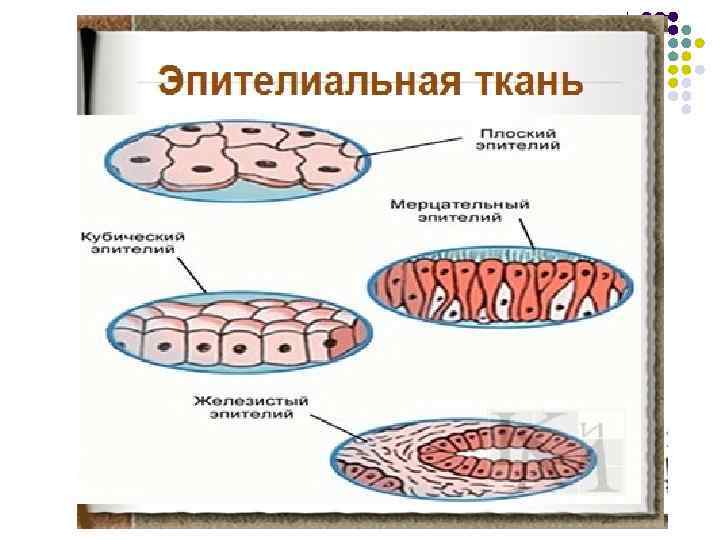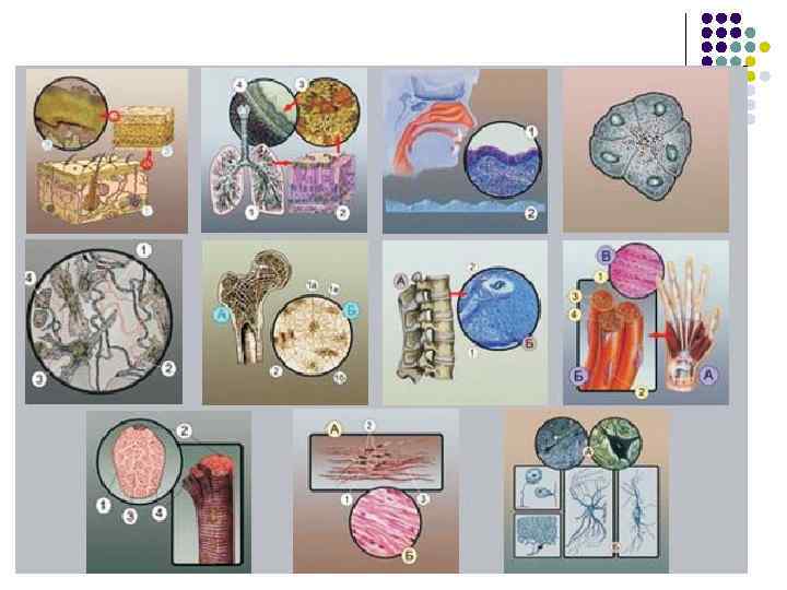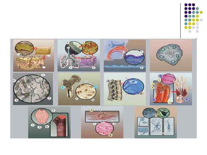 l Большинство животных – многоклеточные организмы. Группы клеток, сходные по происхождению, строению и выполняемым функциям, называют тканями. Наука, изучающая ткани, называется гистологией. l l Ткани животных, в отличие от тканей растений, содержат много межклеточного вещества. У животных различают эпителиальную, соединительную, мышечную и нервную ткани.