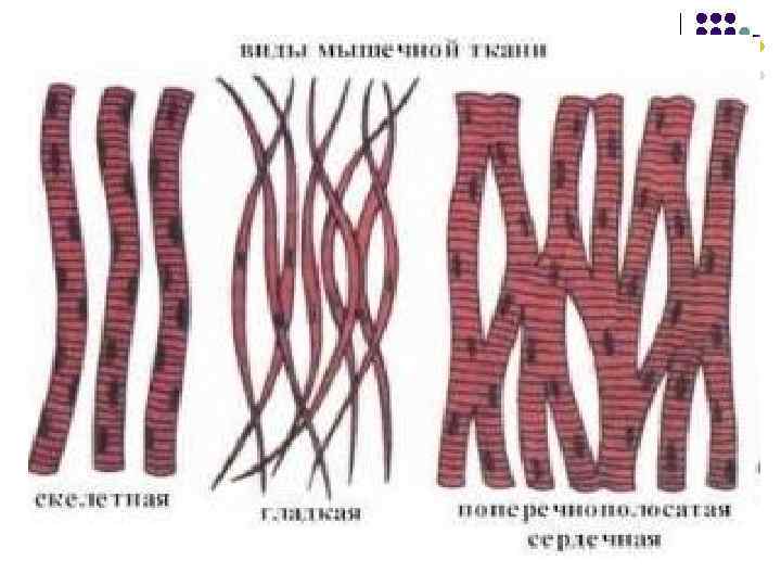 Мышечная ткань l Мышечная ткань составляет основную массу мышц. Она обеспечивает движение самого организма и движение внутри него. Так, передвижение пищи в пищеварительном канале возможно благодаря работе этой ткани. Различают три типа мышечной ткани: поперечно-полосатую, гладкую и сердечную. l Типы мышечной ткани: l Поперечно-полосатая мышечная ткань образует основную массу скелетной мускулатуры. l Гладкая мышечная ткань входит в состав внутренних органов, содержится в стенках кровеносных сосудов, коже, сосудистой оболочке глаза. l Сердечная мышечная ткань образует сердце и обеспечивает его работу.