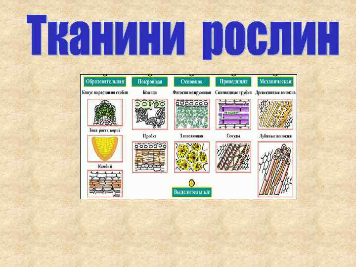 Тканина – це сукупність клітин, подібних за будовою, функціями та спільним походженням. Tkanina jest skupisko komórek, podobne w budowie, funkcji i wspólnym pochodzeniem У рослин зустрічаються такі тканини: U roślin występują takie tkaniny: 1. твірні; 1. tworzące; 2. покривні ; 2. przed nałożeniem; 3. основні; 3. podstawowe; 4. провідні; 4. prowadzący; 5. механічні. 5. mechaniczne.