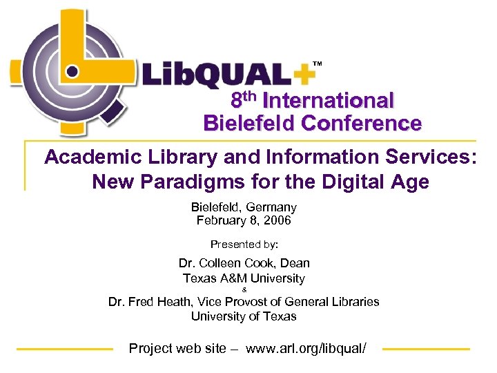 TM 8 th International Bielefeld Conference Academic Library and Information Services: New Paradigms for the Digital Age Bielefeld, Germany February 8, 2006 Presented by: Dr. Colleen Cook, Dean Texas A&M University & Dr. Fred Heath, Vice Provost of General Libraries University of Texas Project web site – www. arl. org/libqual/