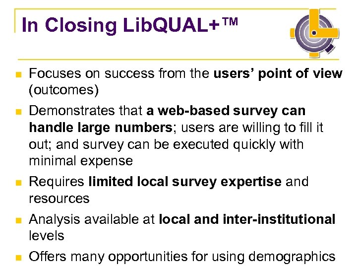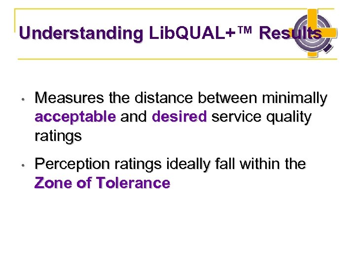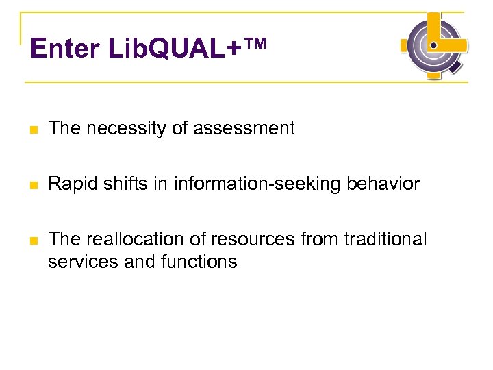 Enter Lib. QUAL+™ n The necessity of assessment n Rapid shifts in information-seeking behavior n The reallocation of resources from traditional services and functions