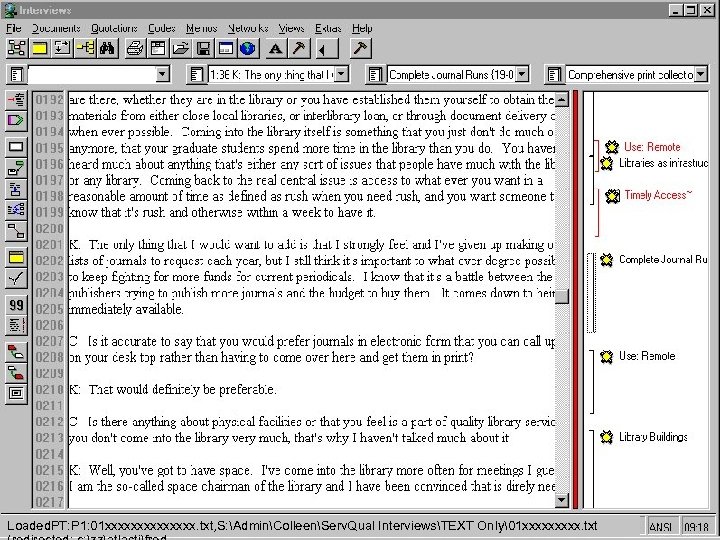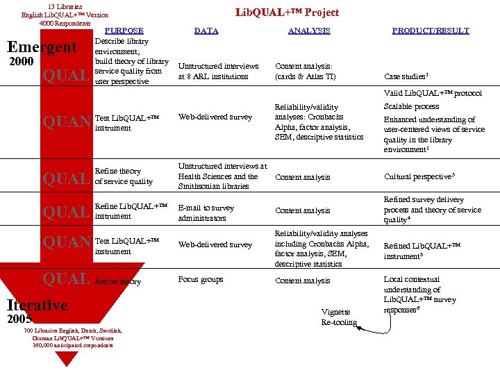 13 Libraries English Lib. QUAL+™ Version 4000 Respondents Emergent 2000 QUAL PURPOSE Describe library environment; build theory of library service quality from user perspective Lib. QUAL+™ Project DATA Unstructured interviews at 8 ARL institutions ANALYSIS Content analysis: (cards & Atlas TI) PRODUCT/RESULT Case studies 1 Valid Lib. QUAL+™ protocol QUAN Test Lib. QUAL+™ instrument Web-delivered survey Reliability/validity analyses: Cronbachs Alpha, factor analysis, SEM, descriptive statistics Scalable process Enhanced understanding of user-centered views of service quality in the library environment 2 QUAL Refine theory of service quality Unstructured interviews at Health Sciences and the Content analysis Smithsonian libraries Cultural perspective 3 QUAL Refine Lib. QUAL+™ instrument E-mail to survey administrators Content analysis Refined survey delivery process and theory of service quality 4 QUAN Test Lib. QUAL+™ instrument Web-delivered survey Reliability/validity analyses including Cronbachs Alpha, factor analysis, SEM, descriptive statistics Refined Lib. QUAL+™ instrument 5 QUAL Refine theory Iterative 2005 700 Libraries English, Dutch, Swedish, German Lib. QUAL+™ Versions 160, 000 anticipated respondents Focus groups Content analysis Vignette Re-tooling Local contextual understanding of Lib. QUAL+™ survey responses 6