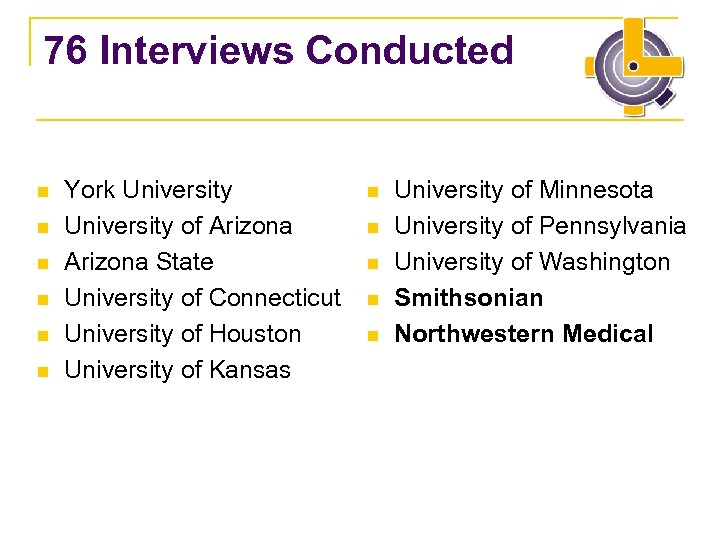 76 Interviews Conducted n n n York University of Arizona State University of Connecticut University of Houston University of Kansas n n n University of Minnesota University of Pennsylvania University of Washington Smithsonian Northwestern Medical