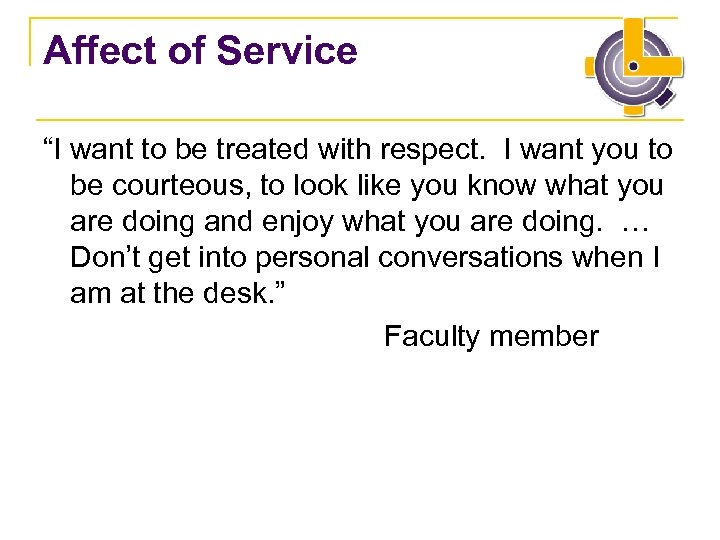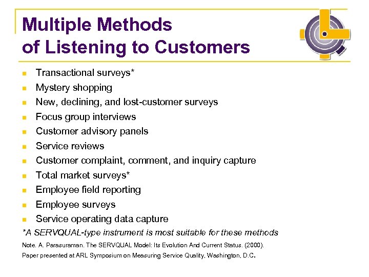 The Lib. QUAL+™ Premise PERCEPTIONS SERVICE “…. only customers judge quality; all other judgments are essentially irrelevant” Note. Zeithaml, Parasuraman, Berry. (1999). Delivering quality service. NY: The Free Press.