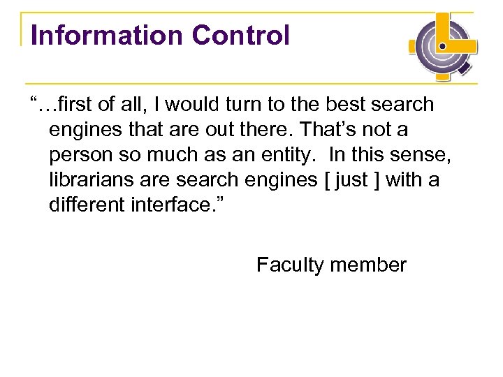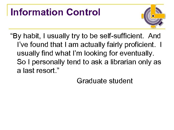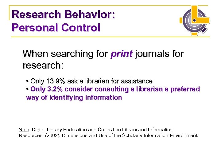 Research Behavior: Personal Control When searching for print journals for research: • Only 13. 9% ask a librarian for assistance • Only 3. 2% consider consulting a librarian a preferred way of identifying information Note. Digital Library Federation and Council on Library and Information Resources. (2002). Dimensions and Use of the Scholarly Information Environment.