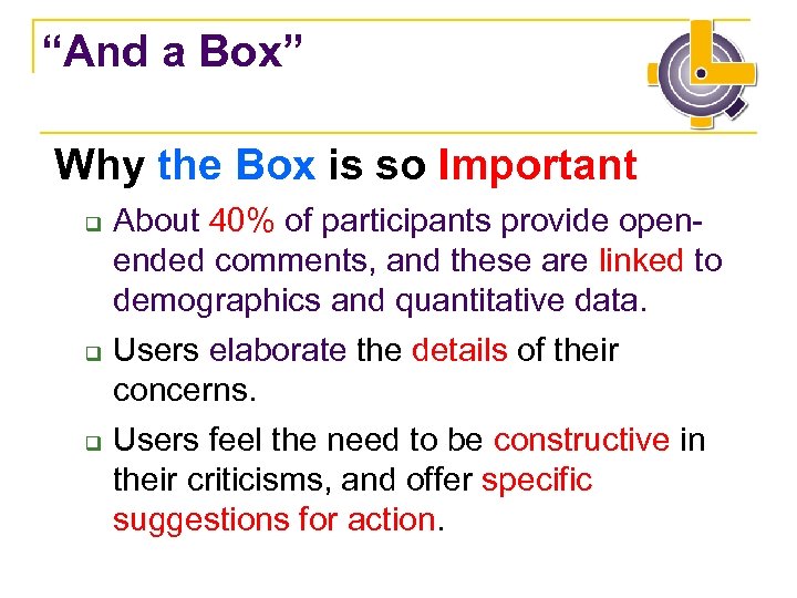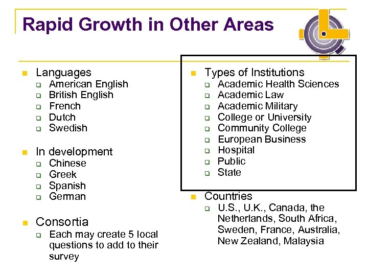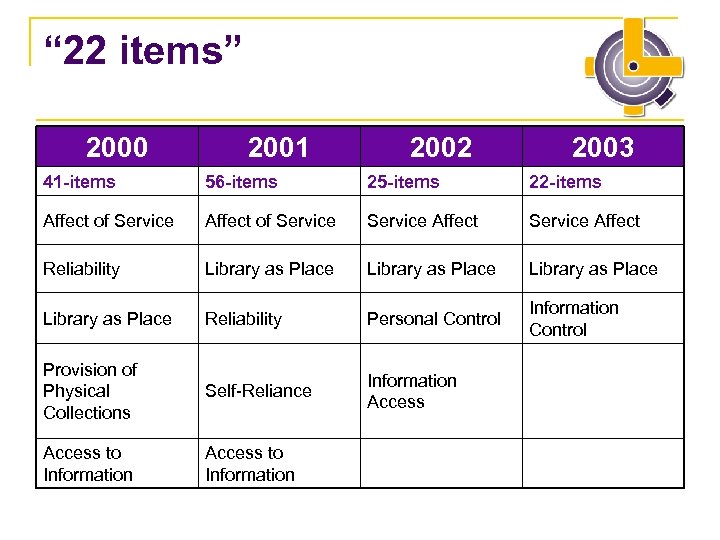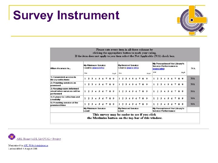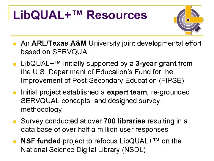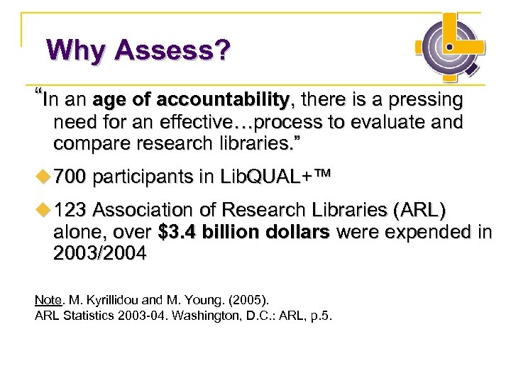 Why Assess? “In an age of accountability, there is a pressing need for an effective…process to evaluate and compare research libraries. ” u 700 participants in Lib. QUAL+™ u 123 Association of Research Libraries (ARL) alone, over $3. 4 billion dollars were expended in 2003/2004 Note. M. Kyrillidou and M. Young. (2005). ARL Statistics 2003 -04. Washington, D. C. : ARL, p. 5.